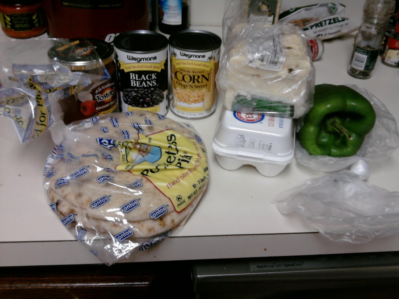 I dumped some salsa on top of the eggs. Now it looked like I had planned this whole mess out. While the cheese was melting, I turned the oven on (I usually have it going at 350F) and heated up my pita. Nothing says home like a warm pillowy pita.
